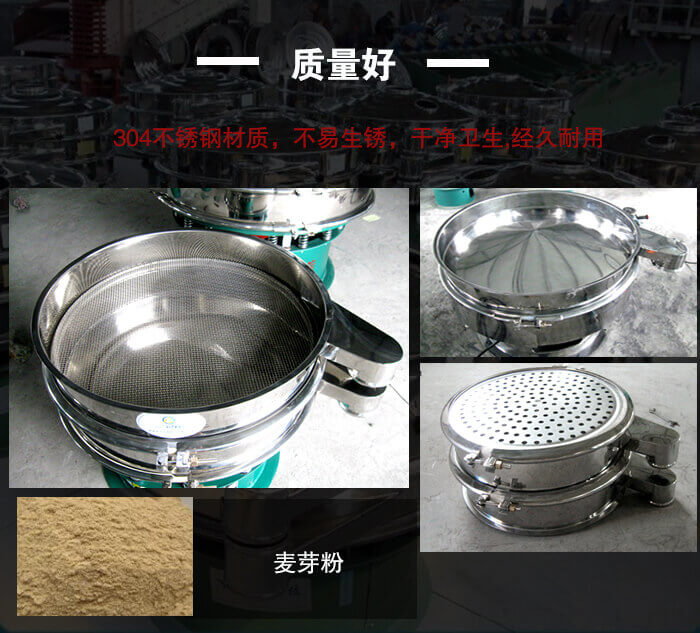 麥芽粉振動篩采用的是優質304不銹鋼材質,不易生銹,干凈衛生,而且不會被物料所氧化,經久耐用;每件產品經過多道程序的檢驗和考核的,保證質量達標還經過了ISO9001的認證