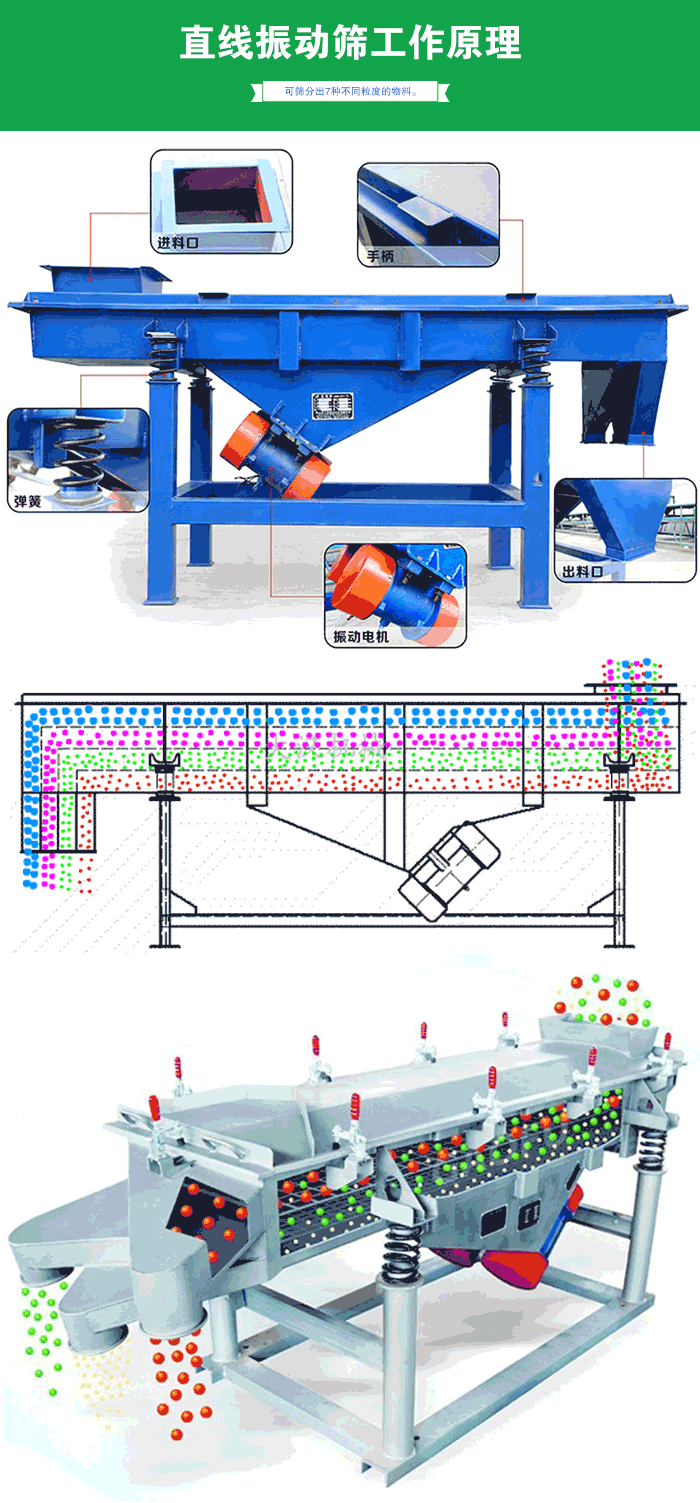 直線振動篩采用雙振動電機驅動,當兩臺振動電機做同步、反向旋轉時,其偏心塊所產生的激振力在平行于電機軸線的方向相互抵消,在垂直于電機軸的方向疊為一合力,因此篩機的運動軌跡為一直線。其兩電機軸相對篩面有一傾角,在激振力和物料自重力的合力作用下,物料在篩面上被拋起跳躍式向前作直線運動,從而達到對物料進行篩選和分級的目的。可用于流水線中實現自動化作業。具有能耗低、效率高、結構簡單、易維修、全封閉結構無粉塵溢散的特點。最高篩分目數400目,可篩分出7種不同粒度的物料。